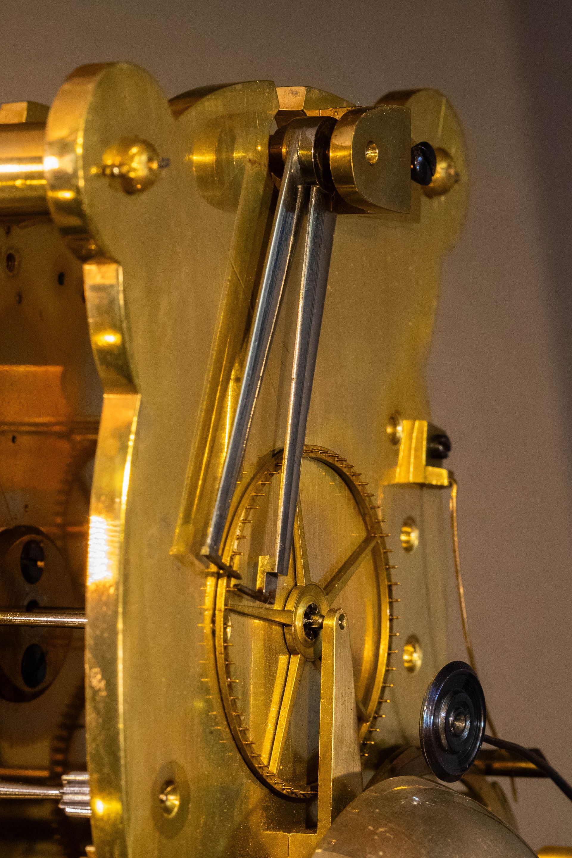 Aussergewöhnliche Pendule, gefertigt in der Zeit des «Directoire» in Frankreich. Aussen liegende Scherenhemmung mit schwerem Kompensationspendel. Schlossscheiben-Schlagwerk mit Halbstundenschlag auf eine Glocke.