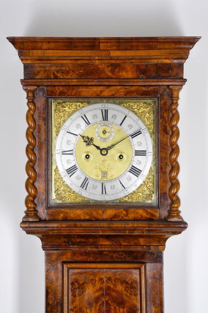 Das quadratische Zifferblatt, 11inch (28cm), sowie die gebläuten Stahlzeiger sind typisch für die Zeit des endenden 17. Jahrhunderts.