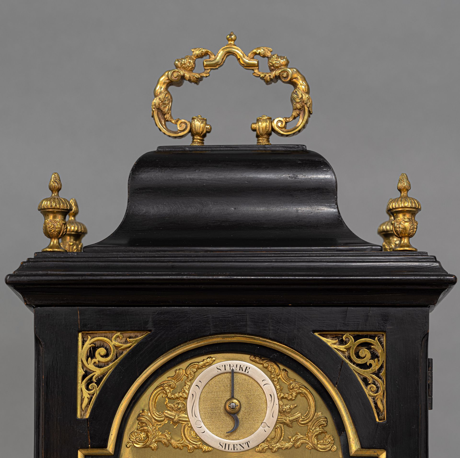 Englische Bracket-Clock, signiert: "Chas. Haley- London", um 1790. Ebonisiertes Holzgehäuse mit Bronze-Appliken. Versilbertes, graviertes Zifferblatt. Die Rückplatine ist ebenfalls signiert mit "Haley - London".