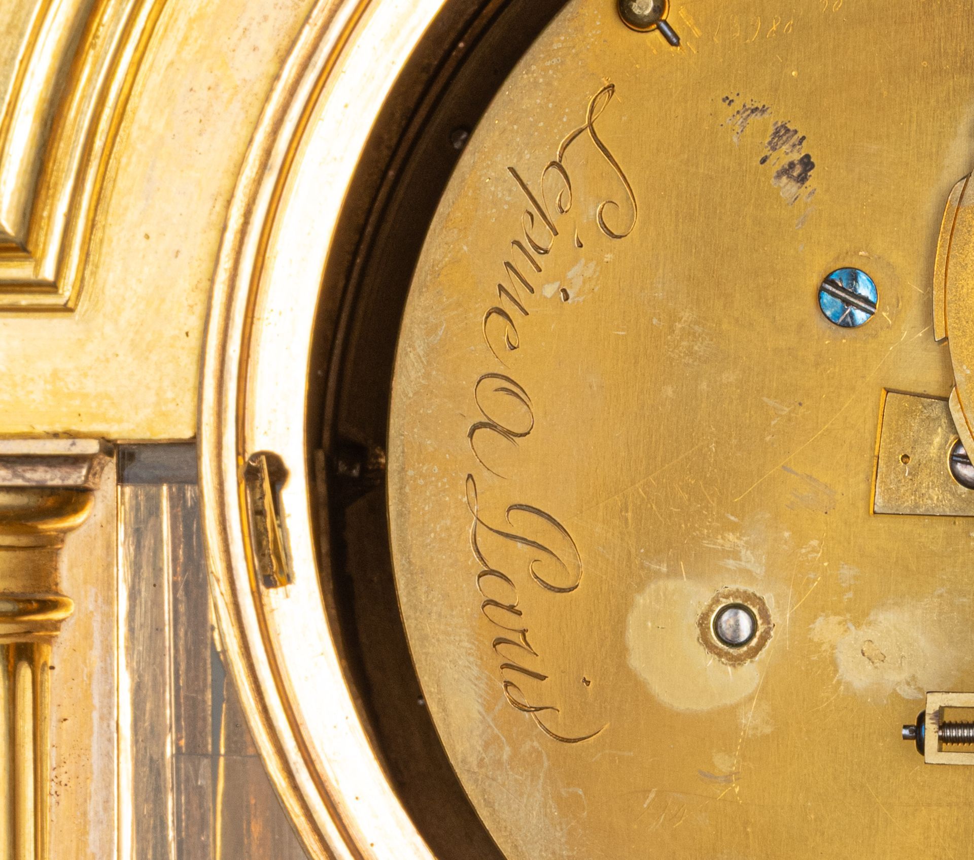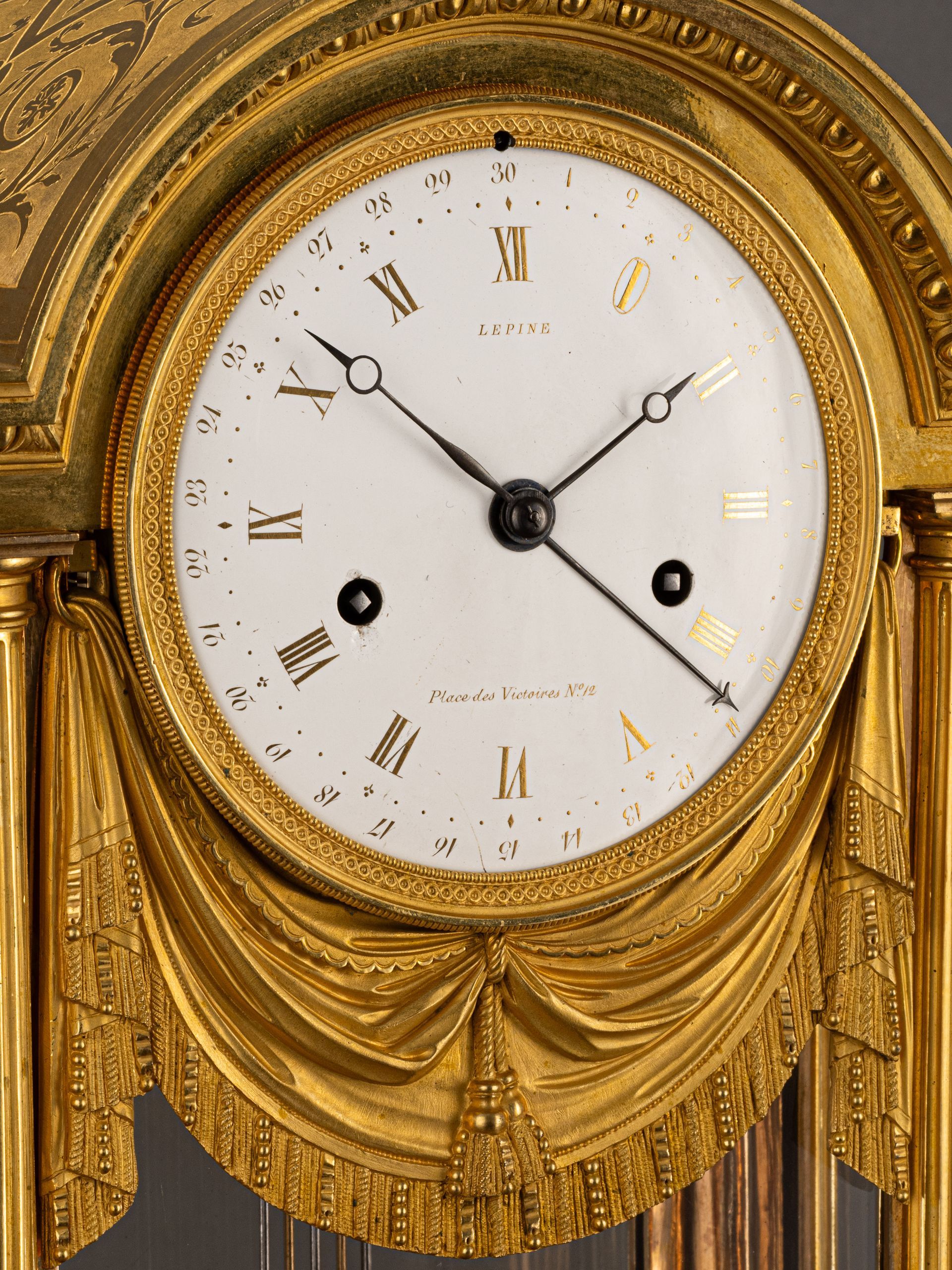 Exzellentes, feuervergoldetes Louis XVI. Bronzegehäuse, fein graviert und ziseliert mit 8 kannelierten, paarweise in den Ecken positionierten Säulen. Rückplatine graviert «Lépine à Paris – No. 4433». Zifferblatt weiss emailliert mit vergoldeten Zahlen und Kalenderanzeige. Uhrwerk mit Ankergang . Schlossscheiben-Schlagwerk mit Halbstundenschlag auf eine Glocke. Paris, um 1800.