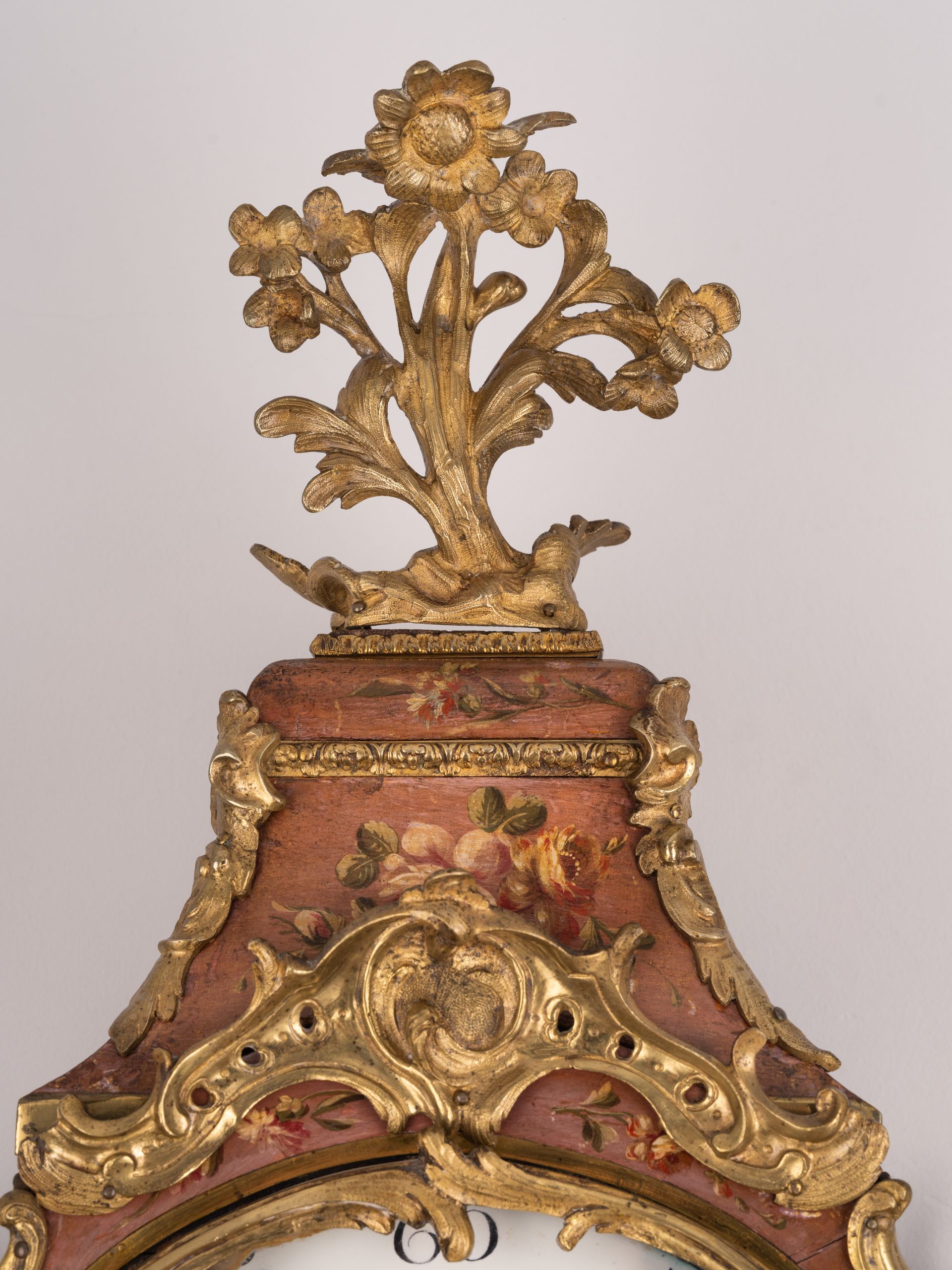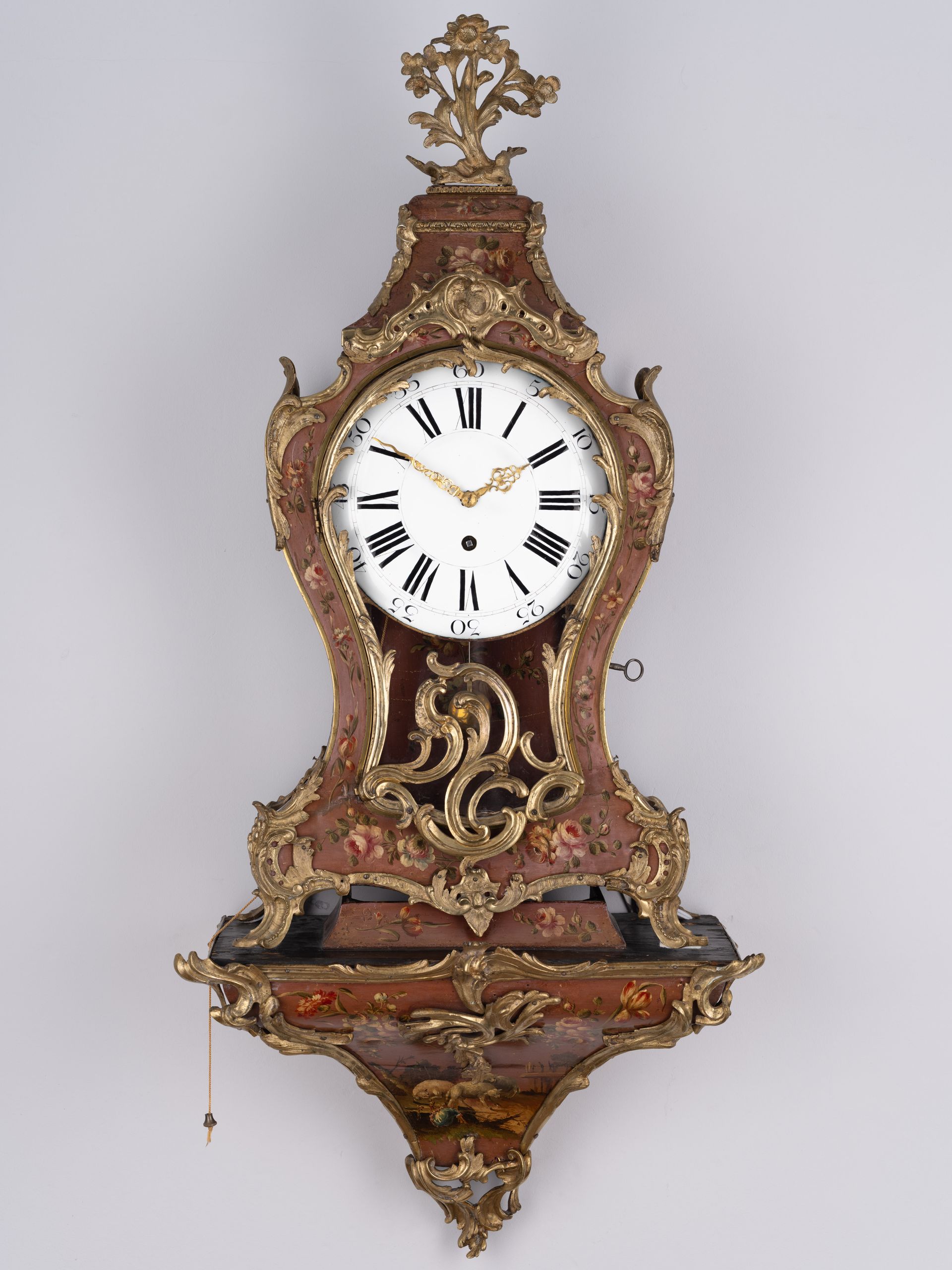 Allseitig elegant geschweiftes Holzgehäuse mit feinem Vernis Martin-Dekor in Form von Blumen, Girlanden und drei Schäfchen auf altrosa Grund. Überaus feiner und reicher, feuervergoldeter Bronzebeschlag. Das weisse Emailzifferblatt mit römischen Stunden- und arabischen Minutenzahlen. Uhrwerk mit Pendel und Spindelgang, sowie Viertel-Zugrepetition mit Schlag auf zwei Glocken. Schweiz um 1750.