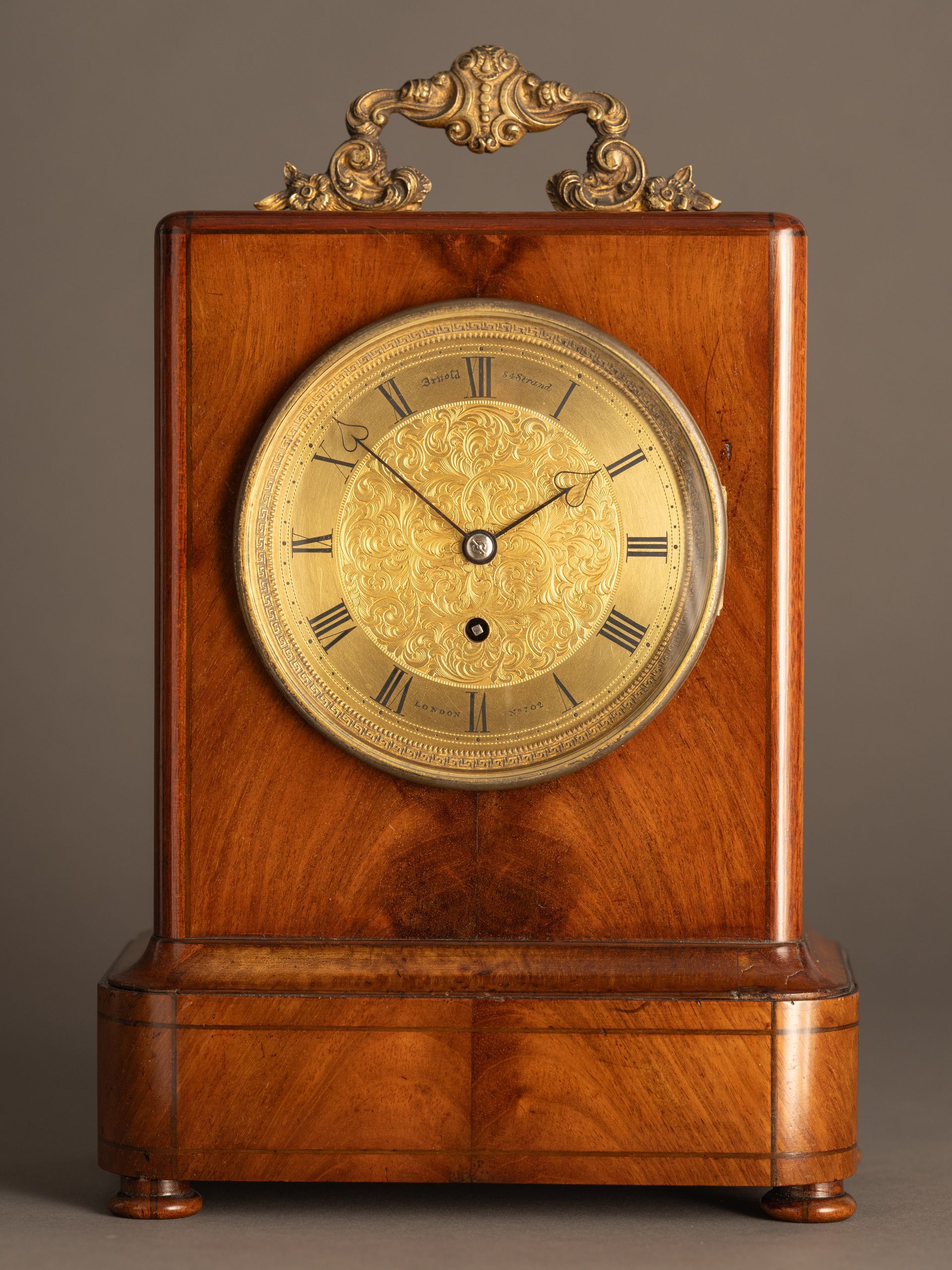 Pendule d`Officier, Courvoisier (unsigniert), Schweiz, 1820. Seltenes, Nussbaum Wurzelmaser-fourniertes Gehäuse , mit feuervergoldetem Bronze-Griff und Füssen.