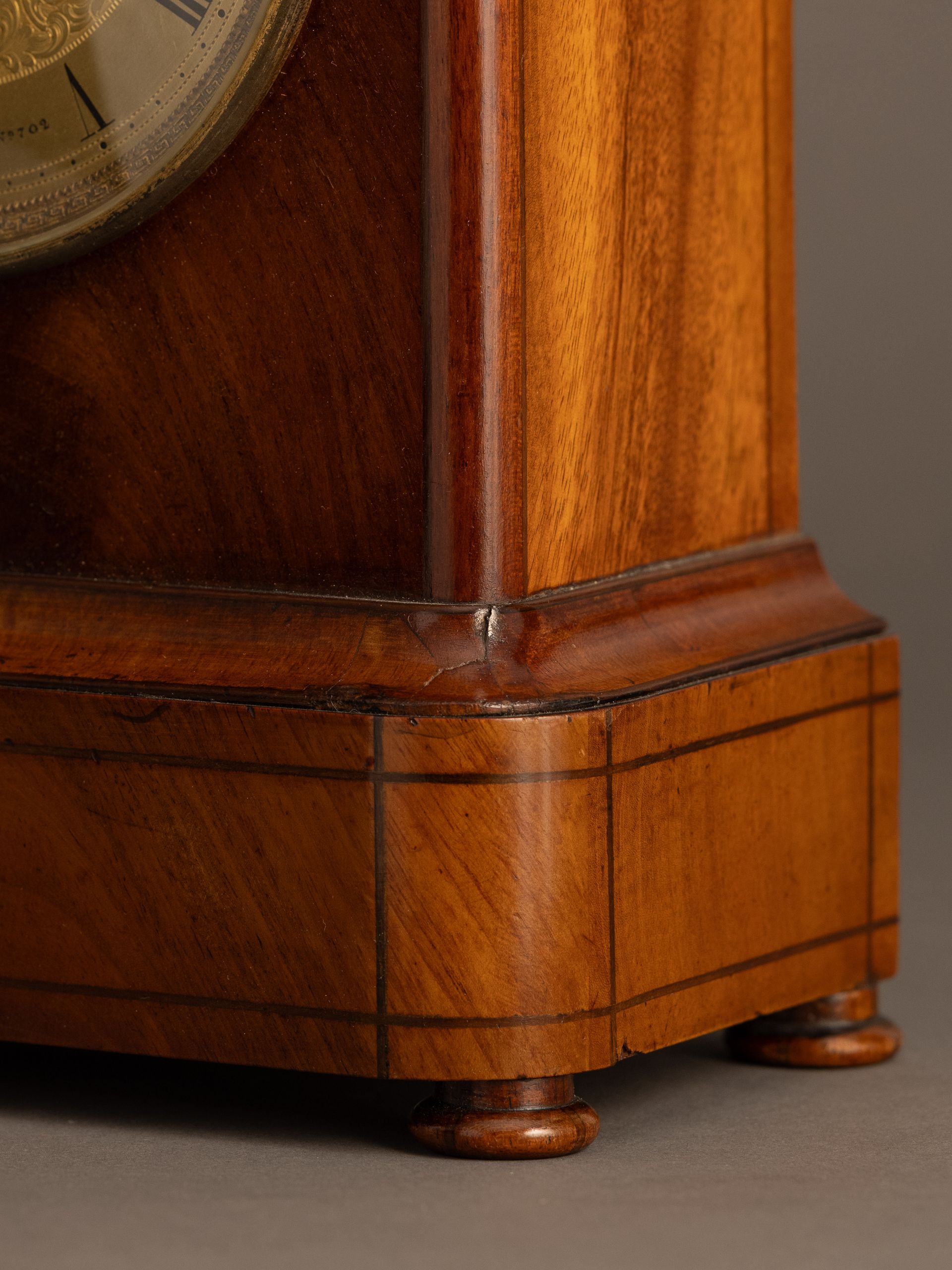 Feine Tischuhr im Wiener Stil (Marriage), Gehäuse im hellen Mahagoni mit zierlichen Intarsien; graviertes und ziseliertes Zifferblatt mit römischen Zahlen; Uhrwerk in schönster Qualität mit Fusée (Kette/Schnecke); Pendel und englisch Ankergang; ohne Schlagwerk; Gravur auf der Rückplatine: «Arnold & Charles Frodsham – 84 Strand»; London um 1845.