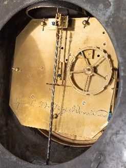 Werk mit Ankergang, und Stundenschlag auf Glocke. Geh- und Schlagwerk mit Schneckenantrieb über Darmsaiten.